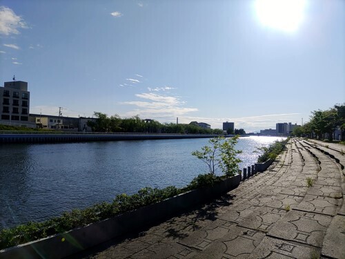 きれいに整備された遊歩道、朝日が川面を照らしています。